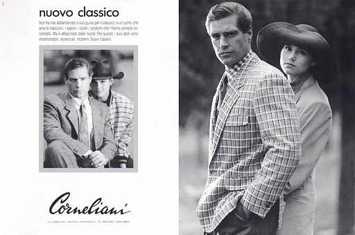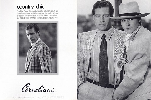 FULL CREDITSBrand: Corneliani EuropeSeason: Spring/Summer 1986Model(s): Scott Webster and Jeanette SchaefersPh: Aldo Fallai