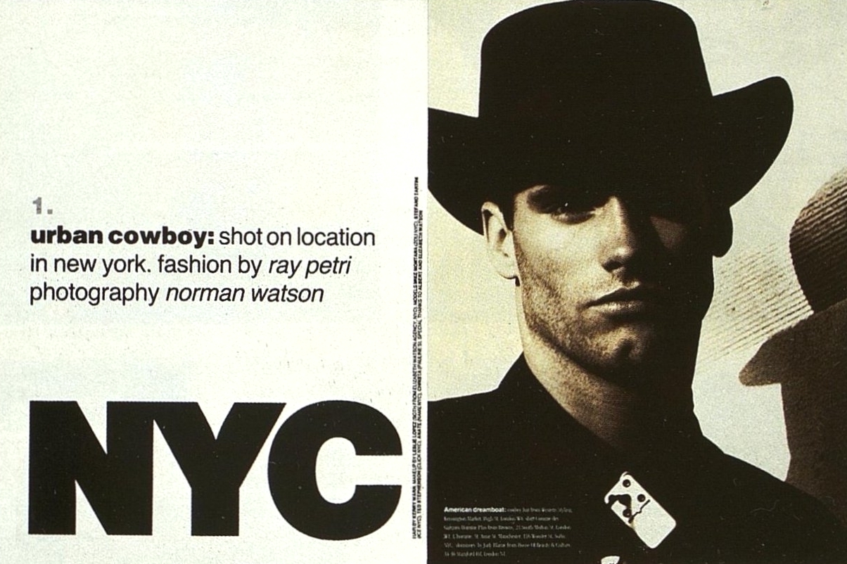 FULL CREDITSBrand: Arena'NYC, Urban Cowboy'Issue: Vol.5 1987Model(s): Mike MontanaPh: Norman WatsonFashion:Stylist: Ray Petri